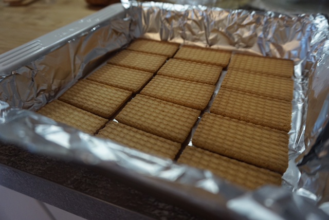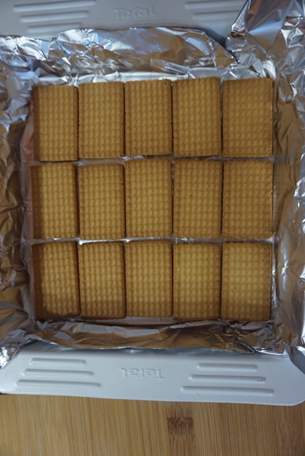 Disporre su una teglia quadrata un foglio di carta stagnola e adagiatevi sopra i biscotti a pancia in su (con le righe verso il basso) – cercate di ottimizzare al meglio lo spazio della vostra teglia senza lasciare troppo spazio tra un biscotto e l’altro.