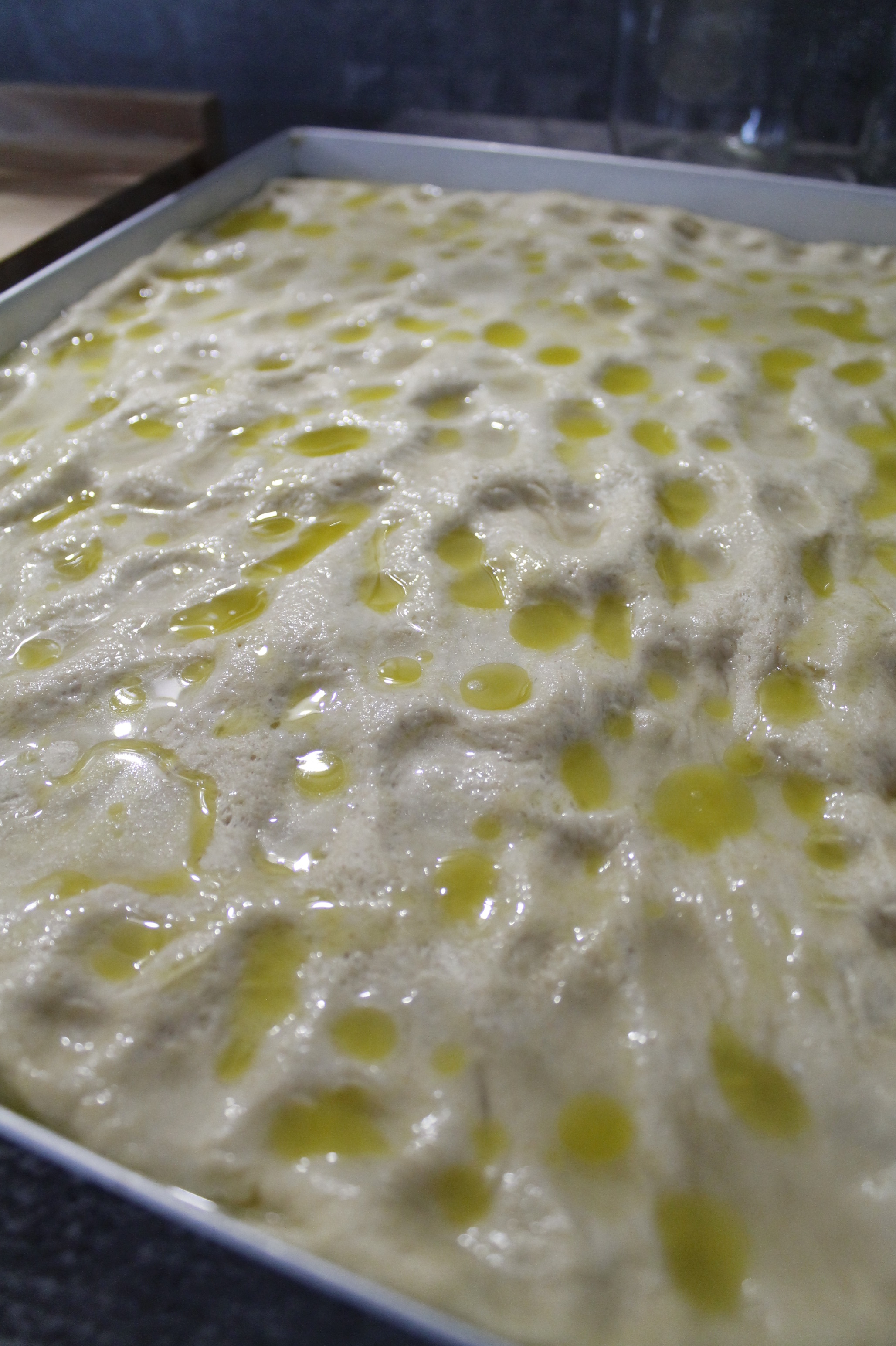 Fatelo lievitare in una ciotola leggermente oliata per 15 minuti, poi oliate abbondantemente una teglia rettangolare da forno e fate le pieghe a portafoglio prima da una parte e poi girando l’impasto di 90° rifatele una seconda volta, arrotondate l’impasto con le mani alla superficie e lasciate lievitare per due ore coperto con un canovaccio.