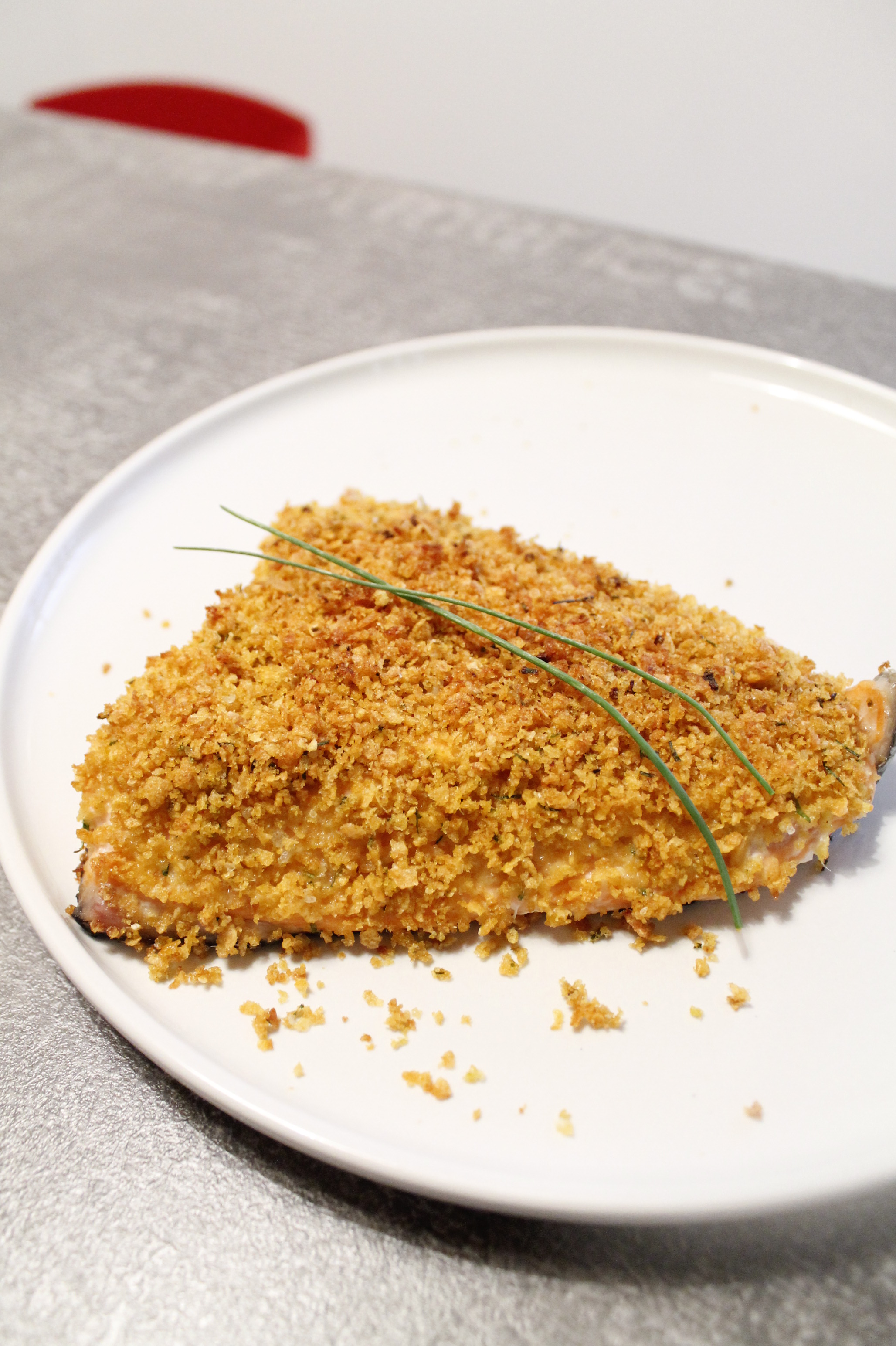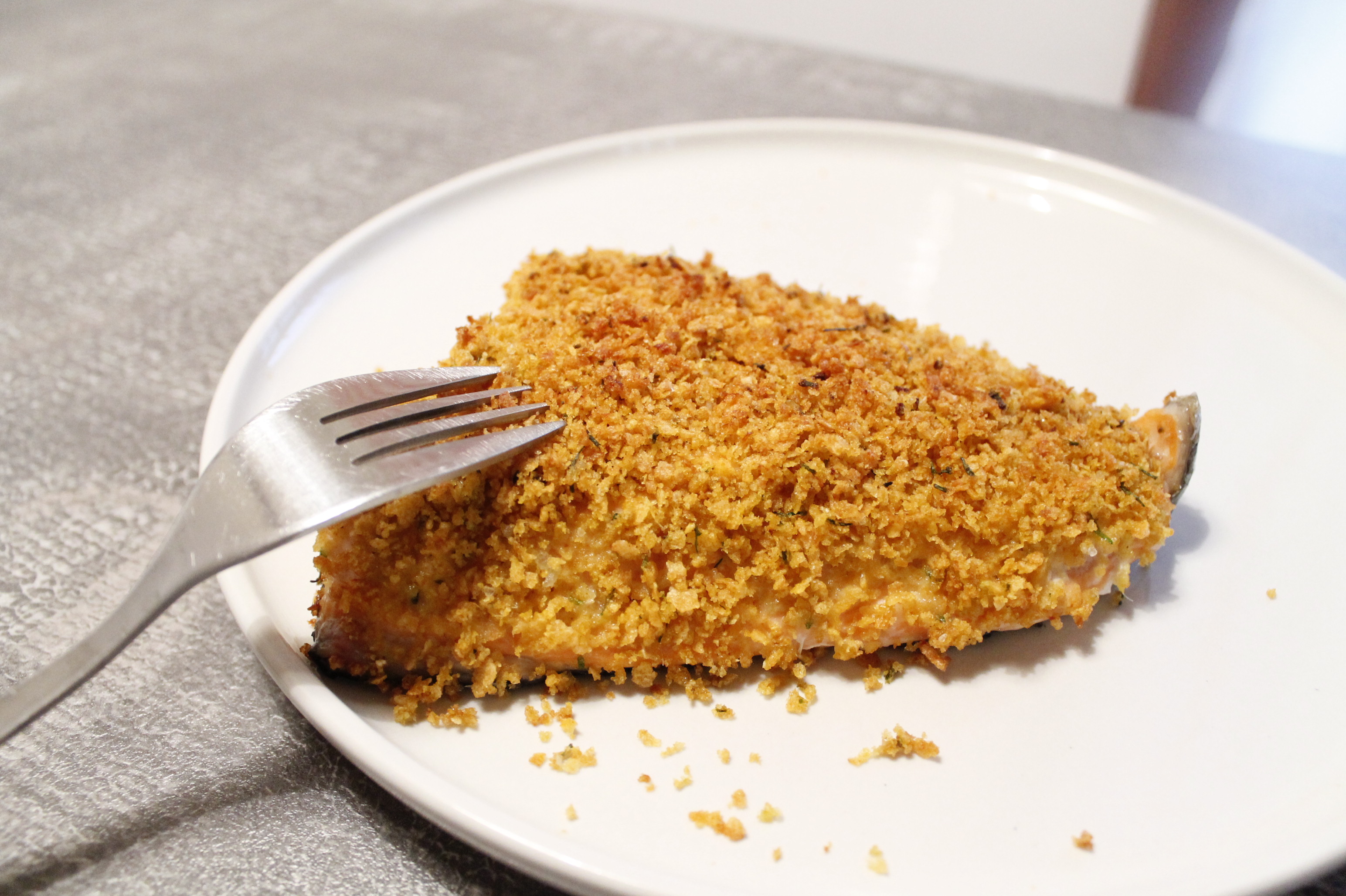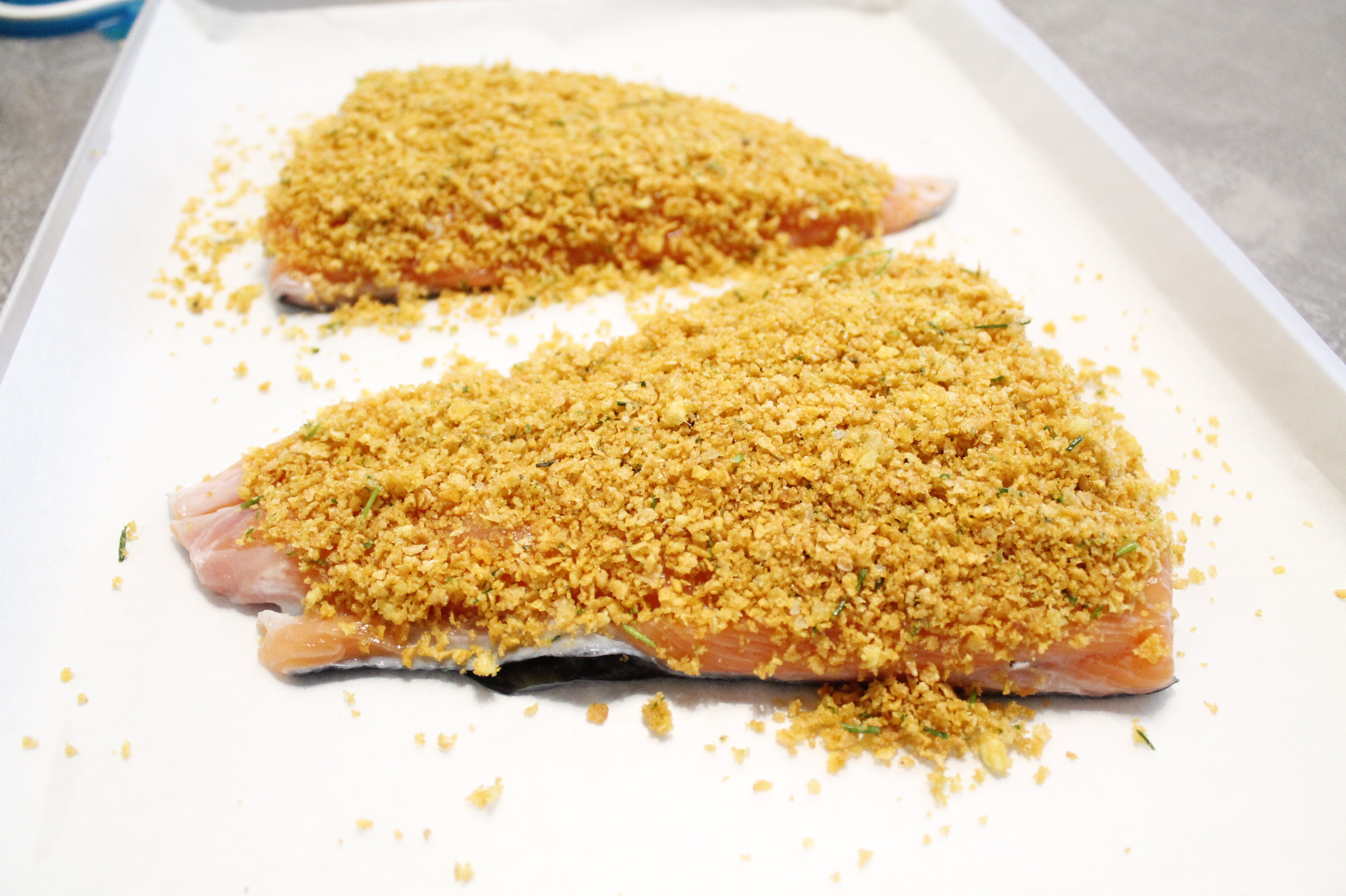 Tritate con il frullatore i corn flakes, lo zenzero, la scorza di limone, l’erba cipollina, sale, e olio EVO a filo (circa 2/3 cucchiai). Impanate i filetti di salmone con la panatura e infornate a 180° per circa 20 minuti.