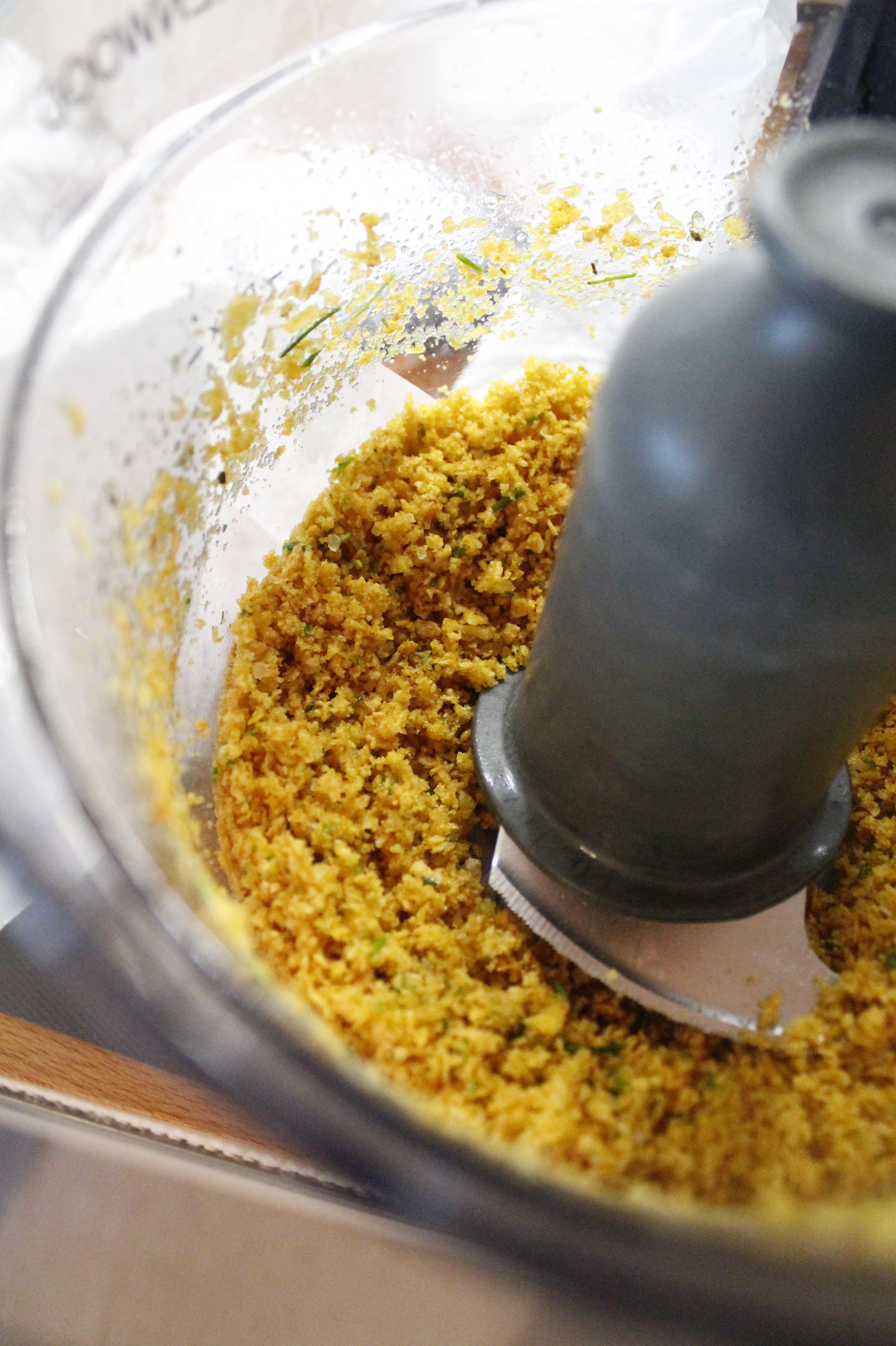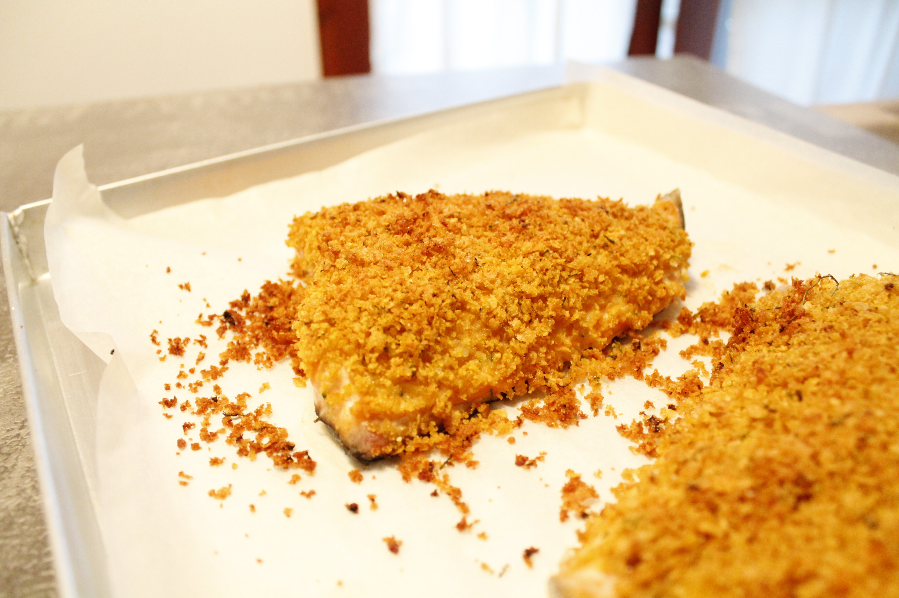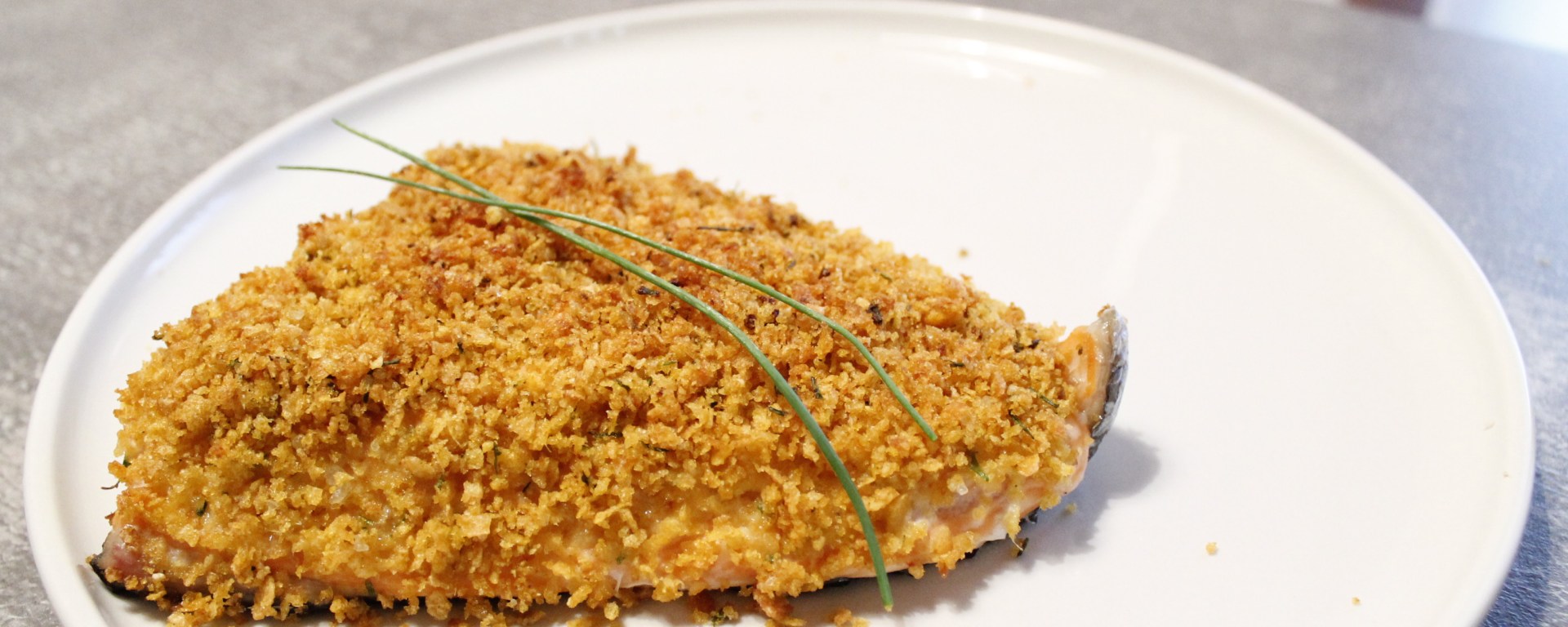 Tritate con il frullatore i corn flakes, lo zenzero, la scorza di limone, l’erba cipollina, sale, e olio EVO a filo (circa 2/3 cucchiai). Impanate i filetti di salmone con la panatura e infornate a 180° per circa 20 minuti.