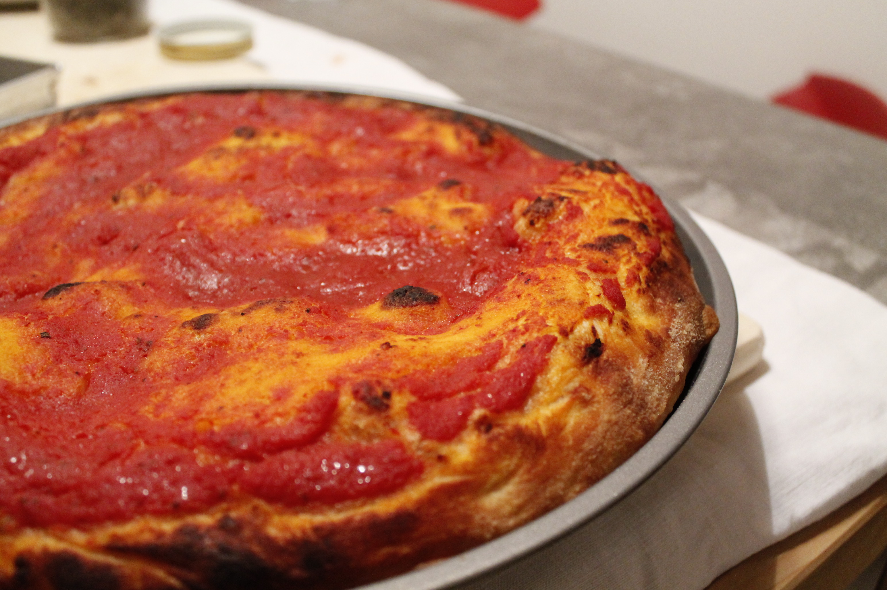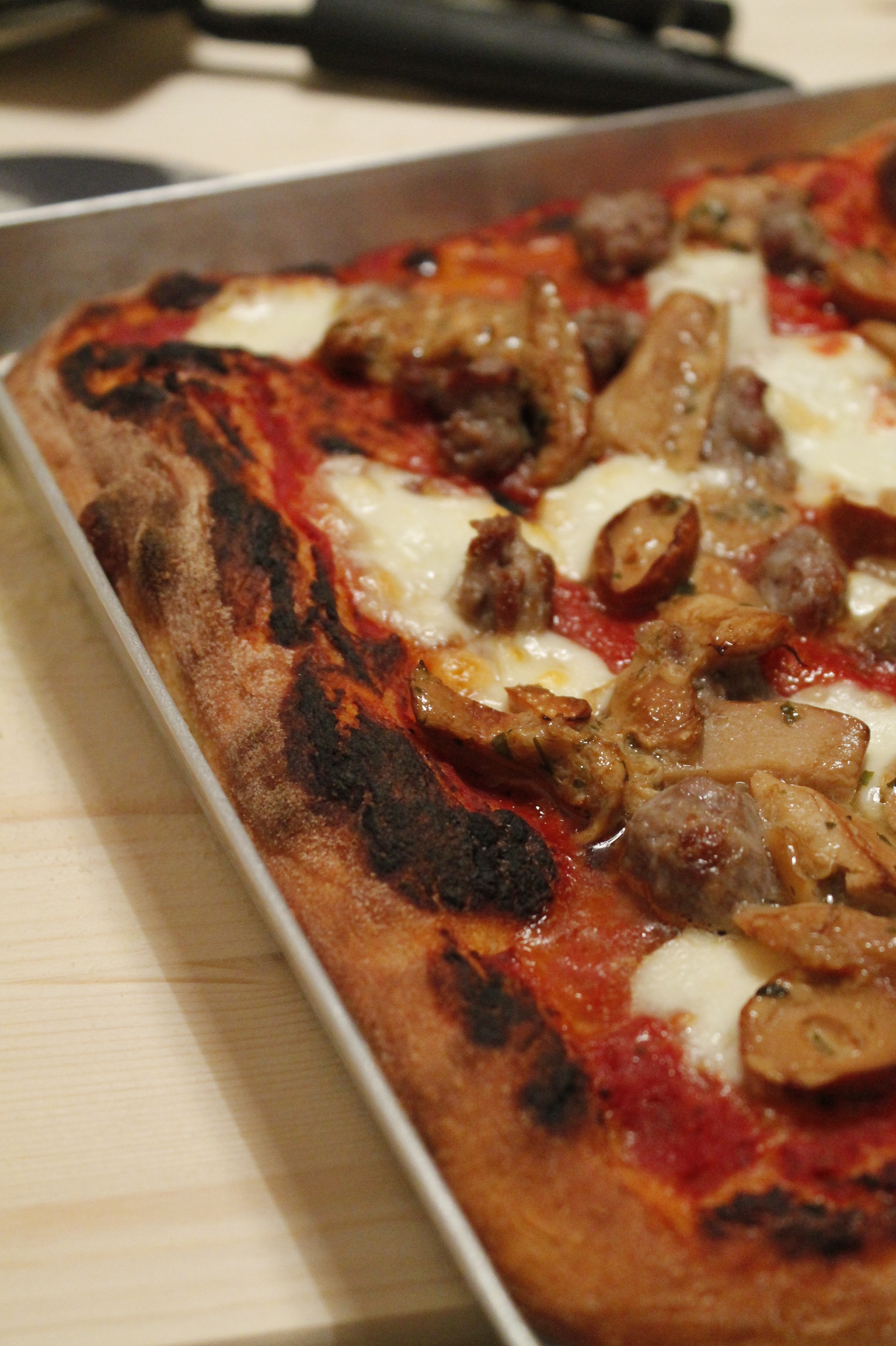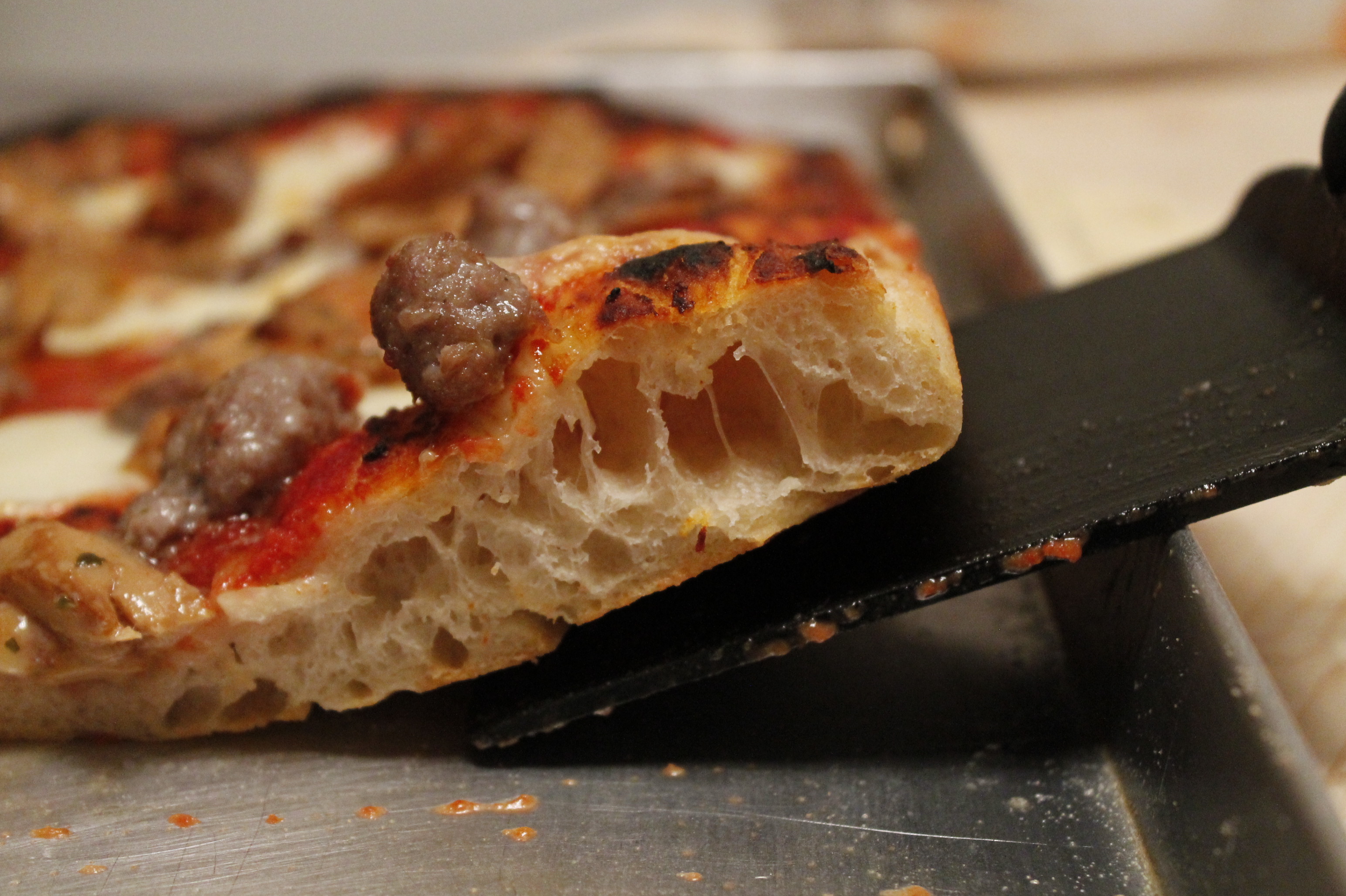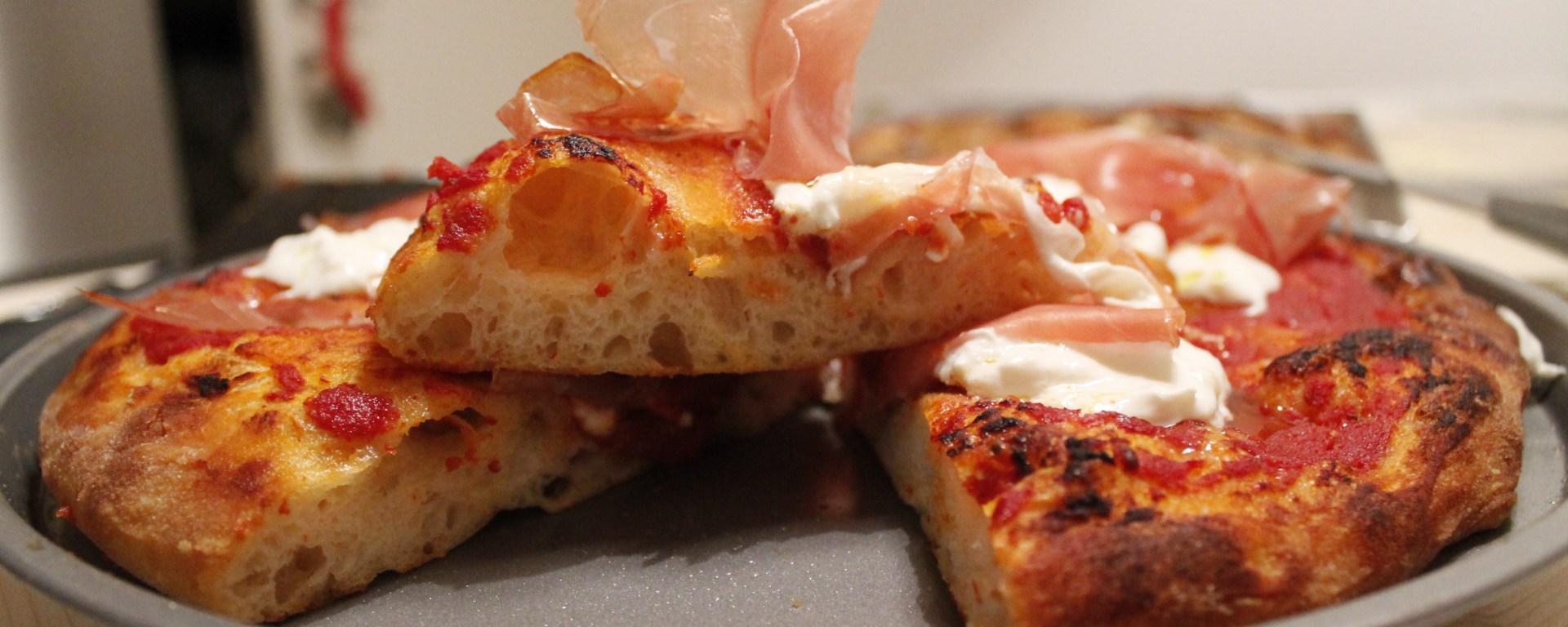 Togliere dal frigo l’impasto 2 ore prima di rilavorarlo, e formare dei panetti per la teglia eseguendo ancora pieghe “slap & fold” e pirlatura (per capire la quantità giusta di impasto da utilizzare per ogni teglia, fare area della teglia * 0.5).