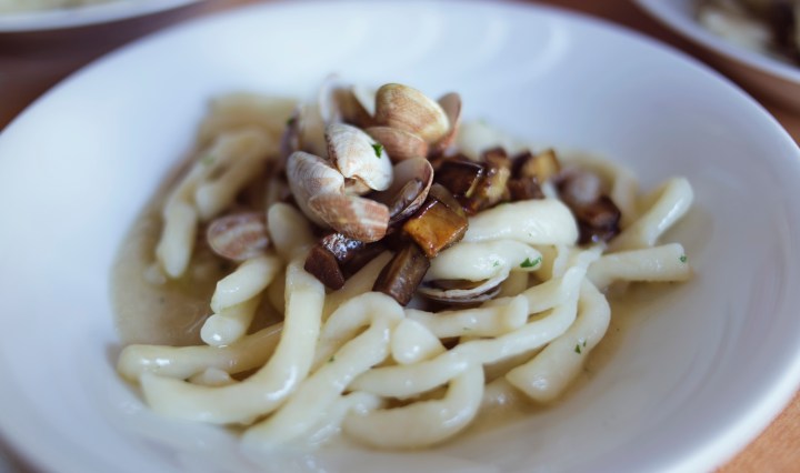 Strozzapreti alle vongole su crema di melanzane e dadolata di melanzane