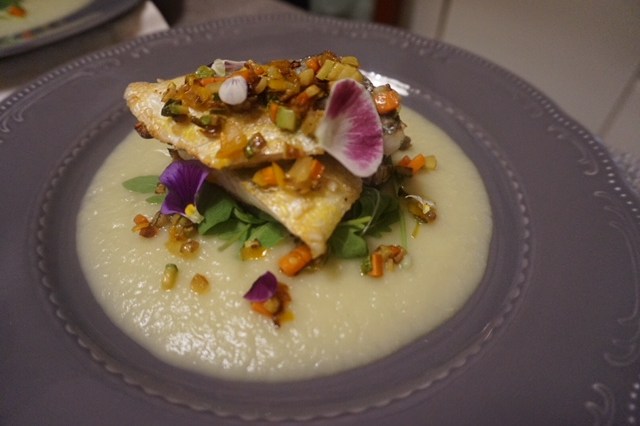 Branzino con brunoise di verdure, capperi e olive taggiasche su crema di finocchio